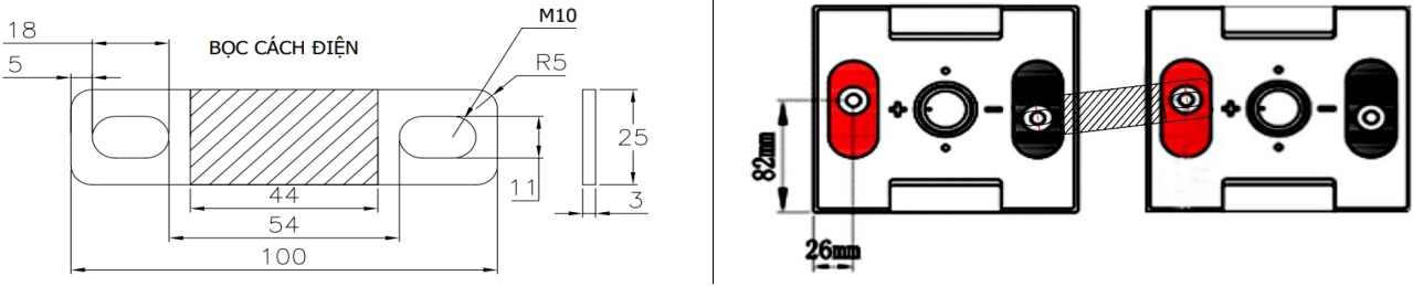 Phụ kiện đính kèm: Thanh nối tiêu chuẩn NSX (cell-cell) 100x25x3 mm, bu-long và vòng đệm, nắp đậy bảo vệ